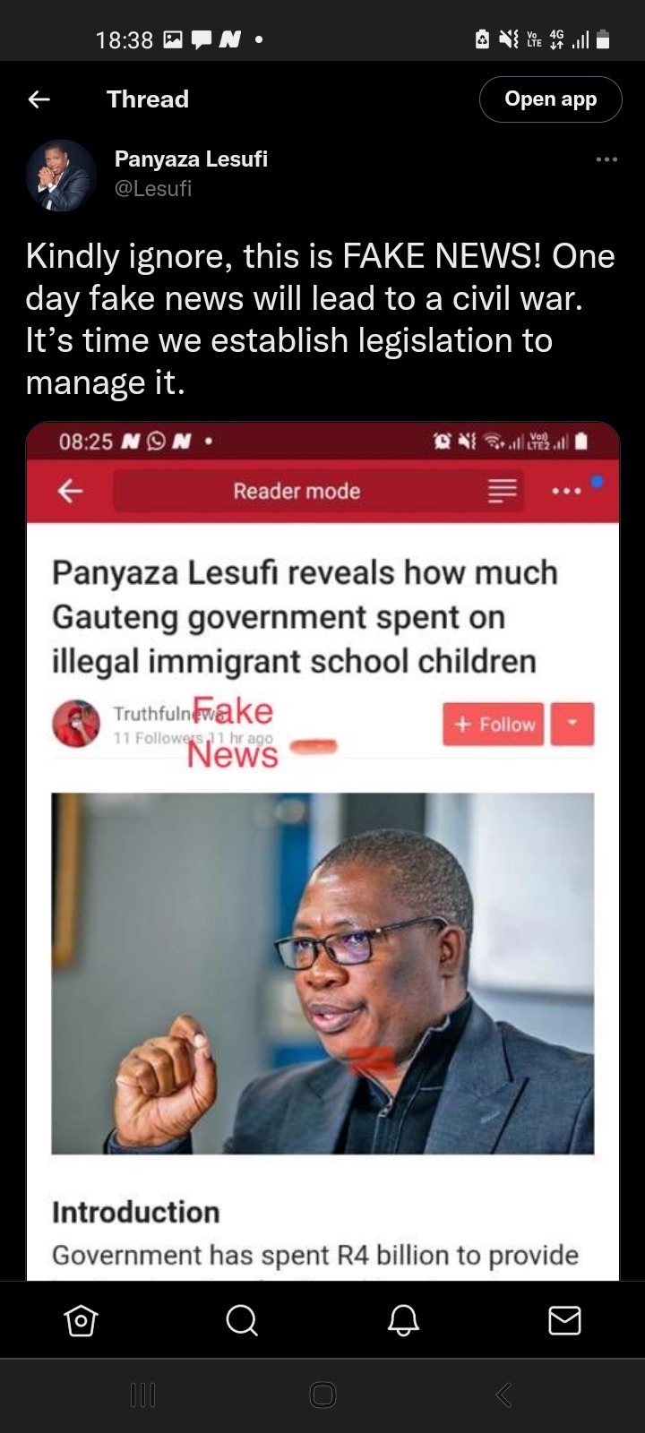 Lesufi took to his Twitter account to say the following ” Kindly ignore, this is fake news! One-day fake news will lead to a civil war. It’s time we establish legislation to manage it”.
