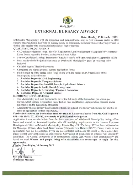 uMshwathi Municipality is inviting applications for its external bursary programme for the 2026 academic year, aimed…
